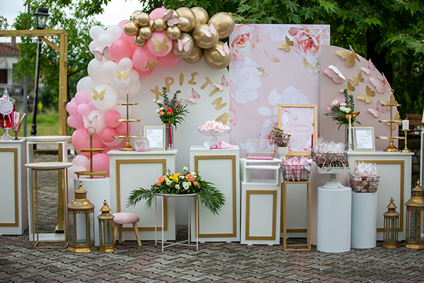 Η Fairytale’s Story ομόρφυνε τη βάπτιση της Χριστίνας με girly ιδέες στολισμού με θέμα την πεταλούδα και τα ανοιξιάτικα λουλούδια! Λευκά, ροζ και χρυσά μπαλόνια πλαισιώνουν το κεντρικό σημείο του σκηνικού όπου ένα πανέμορφο backdrop με ρομαντικό floral pattern έχει στηθεί στον εξωτερικό χώρο της εκκλησίας όπου έγινε η βάπτιση. Φυσικά δεν έλλειπαν τα ποικίλλα candy για τους μικρούς καλεσμένους και μια όμορφη πινέλια αποτελούσα οι αμέτρητες μικρές πεταλούδες!