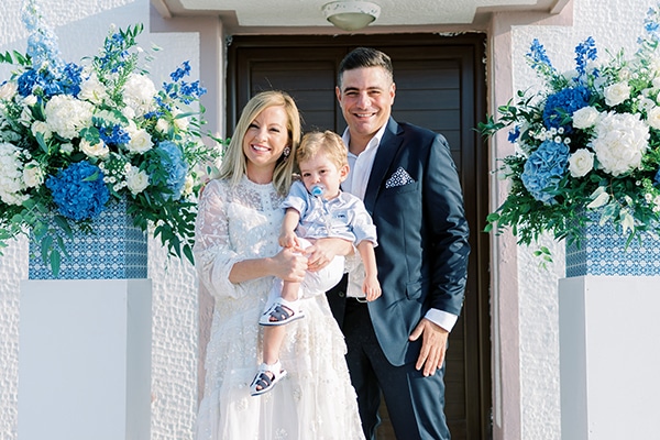 H μητέρα μοιράστηκε μαζί μας: «Η βάπτιση του γιού μας έγινε το καλοκαίρι, στην Ελιά Λακωνίας. Το θέμα της βάπτισης ήταν η Ακτή Αμάλφι. Η επιλογή έγινε γιατί η Ακτή Αμάλφι ήταν το «πρώτο ταξίδι του Κωνσταντίνου», αφού όταν επιστρέψαμε με το σύζυγό μου από ταξίδι μας εκεί μάθαμε ότι ήμουν έγκυος. Τα χρώματα που επιλέξαμε ήταν το μπλε σε συνδυασμό με το λευκό και το pattern που χρησιμοποιήσαμε ήταν το ιταλικό πλακάκι. Επίσης, οι χρωματισμοί των λουλουδιών μας ακολούθησαν αυτή την παλέτα δίνοντας έτσι ένα κομψό και ανάλαφρο στυλ στη δεξίωση. Ένα λευκό κλασσικού τύπου τραπέζι φιλοξένησε το εντυπωσιακό candy bar διακοσμημένο με διάφορα γλυκίσματα, stationaries και λουλούδια όλα σε χρώμα μπλε λευκό. Η διακόσμηση βάπτισης ταίριαξε απόλυτα στο φυσικό περιβάλλον, αφού η εκδήλωση πραγματοποιήθηκε δίπλα στη θάλασσα».