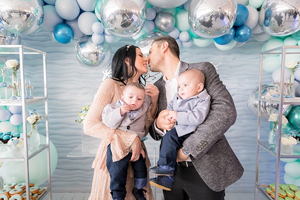 «Δεν υπήρχε κάποιο συγκεκριμένο θέμα για τη βάπτιση. Επιλέχθηκαν τα αρχικά των παιδιών μας και χρώματα σε παστέλ αποχρώσεις γαλάζιου, ασημένιου και μέντας.»