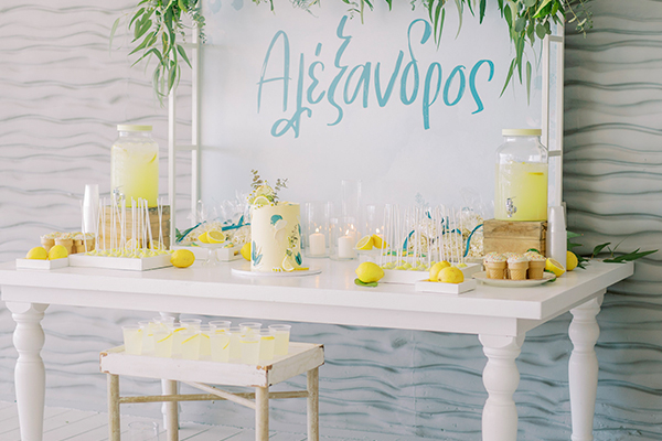 Στον εξαίσιο χώρο του Galu Seaside στην Λάρνακα βαπτίζεται ο μικρός Αλέξανδρος και ο George Panayiotou μας εντυπωσιάζει για άλλη μια φορά με τις υπέροχες ιδέες που προτείνει στο στολισμό! Η μαγική εξωτερική κι εσωτερική θέα του venue προς τη θάλασσα ενισχύεται με τις πιο φωτεινές κίτρινες αποχρώσεις μιας και αυτή η βάπτιση έχει έμπνευση από τα λεμόνια και τις πρασινάδες. Ιδιαίτερα μπουκετάκια από λεμονανθούς και λεμόνια στολίζουν μικρά γυάλινα και χρωματιστά βάζα για τα τραπέζια της δεξίωσης ενώ την προσοχή μας κερδίζει λίγο πιο κάτω το τραπέζι γλυκών με το υπέροχο backdrop διακοσμημένο από πλούσιες κρεμαστές πρασινάδες και κεντρικό στοιχείο το όνομα του μικρού πρωταγωνιστή. Λεμόνια και λεμονάδες έχουν την τιμητική τους και η τούρτα στη μέση φαίνεται τόσο λαχταριστή. Για δωράκια δίνονται ποτήρια για λεμονάδα με μότο “Squeeze the day” σε χάρτινες σακούλες και η αισιοδοξία ξεχειλίζει από την κάθε γωνιά!