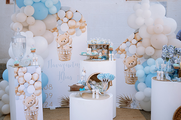Ένα γλυκό αρκουδάκι μέσα σε αερόστατο από μπαλόνια πρωταγωνίστησε σε κάθε στοιχείο της υπέροχης βάπτισης που διοργάνωσε το Eventi By Dominari. Οι λευκές, μπεζ και γαλάζιες αποχρώσεις των μπαλονιών, των λουλουδιών και των γλυκών δημιούργησαν μια αρμονική ατμόσφαιρα, αναδεικνύοντας την τρυφερότητα και τη χαρά της στιγμής.Η βάπτιση του μικρού Παναγιώτη – Ηλία είχε μια όμορφή διακόσμηση που σίγουρα ξεχώρισε και στα μάτια όλων!