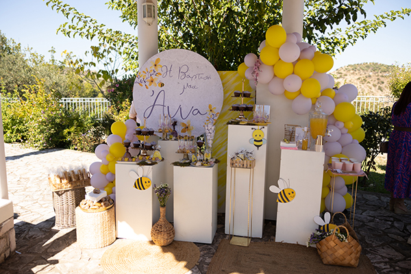 Ιδέες διακόσμησης για μια φωτεινή βάπτιση στις αποχρώσεις του κίτρινου και με θέμα τη μέλισσα μοιραζόμαστε σήμερα μαζί σας από Aritale και εσείς δεν πρέπει να τις χάσετε! Ξύλινες κυψέλες, αμέτρητα μπαλόνια σε λευκό και κίτρινο χρώμα και μπουκετάκια από αμάραντα δημιουργούν ένα φυσικό setting γεμάτο χαρά και ζωντάνια από το οποίο ξεπροβάλλουν χαριτωμένες μέλισσες για τη βάπτιση της μικρής Άννας. Εμείς λατρέψαμε όλες τις όμορφες ιδέες διακόσμησης μαζί και τις υπέροχες μπομπονιέρες με κουφέτα σε μπουκετάκι από αθάνατα αλλά και το βαζάκι με μέλι ιδανικό για να γλυκάνει τους καλεσμένους αυτής της βάπτισης!