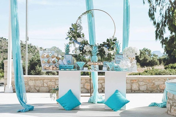 «Today I want to be a dinosaur» μας δηλώνει η ομάδα της Love Stories Luxury Weddings & Events, παρουσιάζοντάς μας αυτές τις πανέμορφες ιδέες διακόσμησης για βάπτιση αγοριού στο χρώμα του γαλάζιου. Η κυκλική αψίδα στολισμένη με τα πιο ανοιξιάτικα λουλούδια στα χρώματα του λευκού – light blue και την πρασινάδα, οι γαλάζιοι ανανάδες, οι μεγάλες γυάλινες βάσεις με τα ζαχαρωτά και τα πεντανόστιμα donuts, καθώς επίσης και τα μαξιλάρια με τα υφάσματα στα φωτεινά χρώματα του γαλάζιου έδεσαν αρμονικά και μας χάρισαν την αύρα που προσφέρει κάθε ελληνικό νησί.