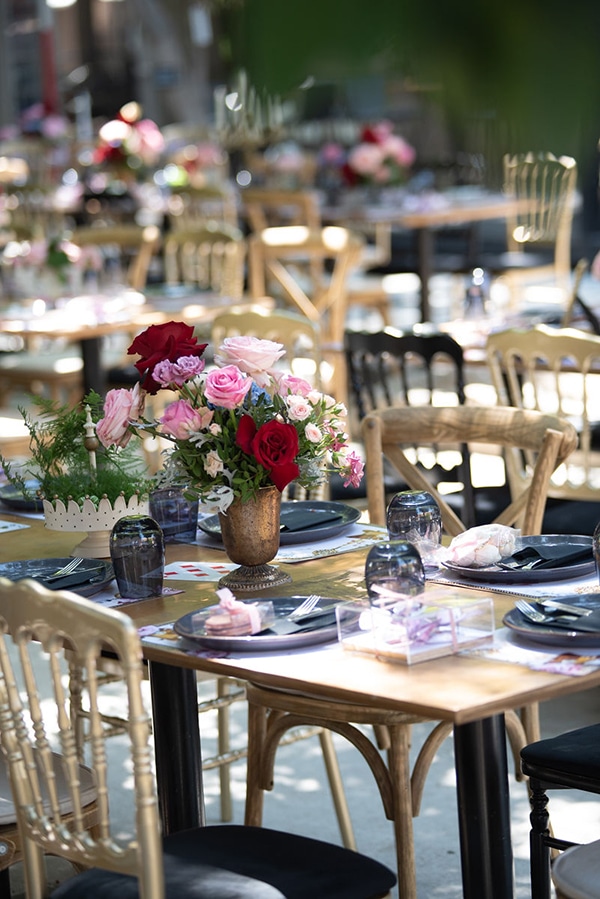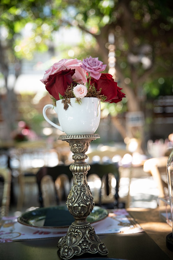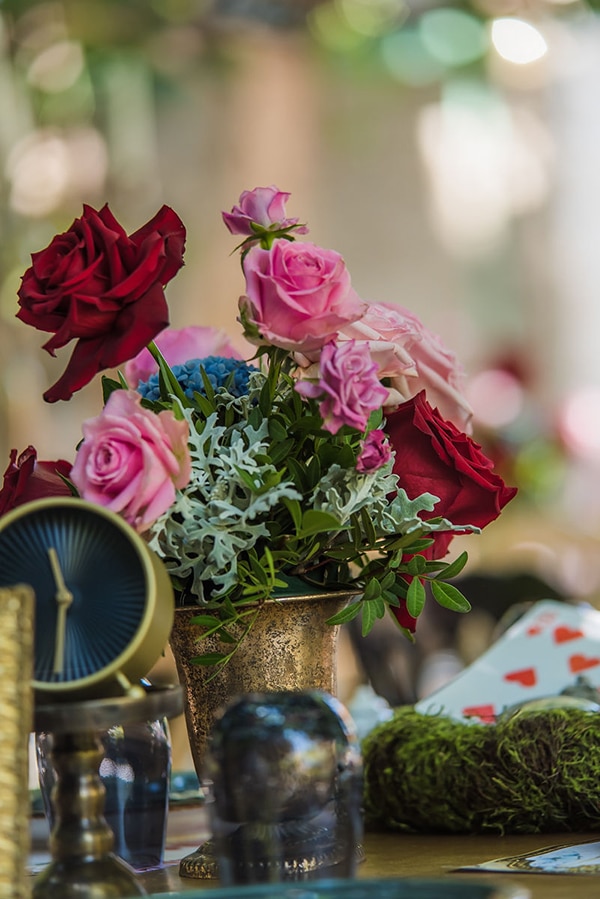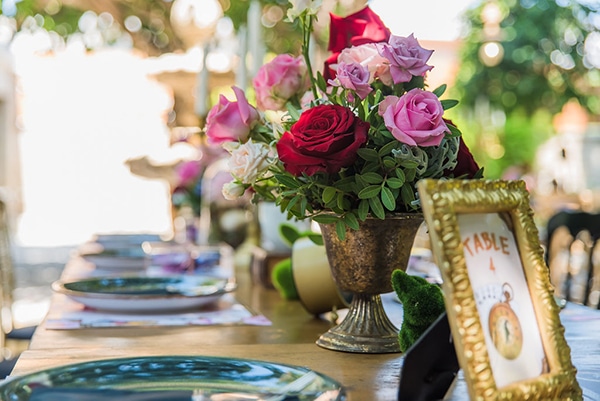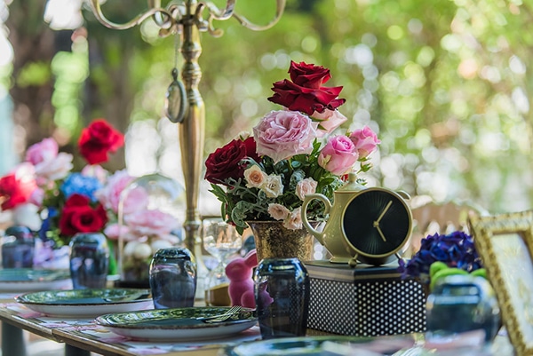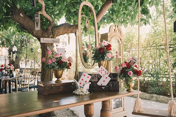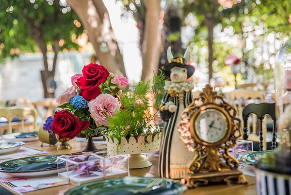 Εάν ονειρεύεστε κι εσείς ένα παραμυθένιο σκηνικό για τη βάπτιση του δικού σας παιδιού, οι ιδέες διακόσμησης που παρουσιάζουμε σήμερα θα σας αρέσουν πολύ! Η ταλαντούχα ομάδα του Αnthologion με το ταλέντο και την δημιουργικότητά της δημιούργησε ένα ονειρεμένο σκηνικό που θα σας παρασύρει από το πρώτο λεπτό στον κόσμο του παραμυθιού. Με κυρίαρχο θέμα το πολυαγαπημένο παιδικό παραμύθι της Αλίκης στη Χώρα των Θαυμάτων, ο χώρος της δεξίωσης διακοσμήθηκε με υπέροχες ανθοσυνθέσεις σε ζωηρά χρώματα και χρυσά διακοσμητικά ενώ ταξιδιωτικές βαλίτσες και ρολόγια μας ταξιδεύουν στο χρόνο ζωντανεύοντας την κάθε εικόνα του παραμυθιού με τον πιο όμορφο τρόπο. Απολαύστε μέσα από τις παρακάτω φωτογραφίες αυτές τις υπέροχες ιδέες διακόσμησης και σχεδιάστε και εσείς μια παραμυθένια βάπτιση!