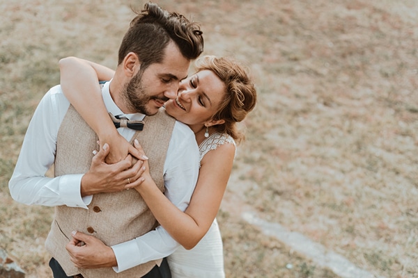 H νύφη μοιράστηκε μαζί μας: «Ο γάμος μας πραγματοποιήθηκε το φθινόπωρο, στον Ταξιάρχη Χαλκιδικής. Με τον Άγγελο ήταν καρπική η γνωριμία μας! Εγώ δούλευα πολλά χρόνια σε μια κατασκευαστική εταιρεία, η οποία συνεργαζόταν με την τεχνική εταιρεία ανελκυστήρων που είχαν ο Άγγελος. Ποτέ όμως όλα αυτά τα χρόνια δεν είχαμε συναντηθεί. Όταν άλλαξα δουλειά ήρθε ο θείος του να με δει, γιατί με τον θείο γνωριζόμασταν πολλά χρόνια και μαζί του ήταν και ο Άγγελος. Από την ώρα που τον είδα δεν χρειάστηκε άλλο. Είναι αυτό που λένε έρωτας με την πρώτη ματιά, πραγματικά! Μετά ρωτούσα όποιον μπορεί να τον ήξερε, ποιος είναι και αν είναι ελεύθερος και όλα όσα μπορούσα να μάθω γι’ αυτόν (δεν μπορούσα να ρωτήσω ευθέως τον θείο του). Από εκείνη την ημέρα, ο Άγγελος δεν σταμάτησε να έρχεται στην δουλειά να με βλέπει κάθε μέρα (γιατί και αυτός έπαθε το ίδιο με εμένα, δεν ήταν μόνο από την δική μου την πλευρά). Μετά από λίγο καιρό γίναμε ζευγάρι! Η πρόταση γάμου ήρθε αναπάντεχα μετά από σχεδόν πέντε μήνες. Με τον Άγγελο μείναμε μαζί μετά τον ένα μήνα σχέσης. Οπότε, μια μέρα που γύρισα από την δουλειά και με είχε πάρει ο ύπνος έρχεται ο Άγγελος δίπλα στον καναπέ πεσμένος κάτω, με ένα κουτάκι στο χέρι του, με ξυπνάει και μου λέει “θέλεις να γίνεις γυναίκα μου;” Αν ρωτήσετε τον Άγγελο θα σας πει ότι έχασα τα λόγια μου, έλεγα κάτι ασυναρτησίες. Η απάντηση ήταν εννοείται “Ναι”. Ο Άγγελος είναι από τους καλύτερους ανθρώπους που έχω γνωρίσει! Γι’ αυτό του λέω συνέχεια ότι θα πάει στον παράδεισο!»