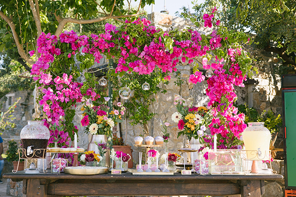Η διακόσμηση της βάπτισης της μικρής Ελένης στο Ηράκλειο είναι χάρμα οφθαλμών! Κι αυτό οφείλεται στην Eros Events που ετοίμασε για την περίσταση κάτι το φανταστικό! Το dessert table της μικρής, που γίνεται πόλος έλξης μικρών και μεγάλων, δημιουργείται από πλούσιες φούξια βουκαμβίλιες και κρεμαστές γυάλες με κεριά που συμπληρώνονται από μοντέρνα ασημί βάζα, πολύχρωμα μπουκετάκια λουλουδιών και λαχταριστές λιχουδιές που ενθουσιάζουν φίλους και καλεσμένους! Τις εντυπώσεις κλέβει και ο στολισμός της κολυμπήθρας που εμπλουτίζεται από εκπληκτικά ανοιξιάτικα λουλούδια σε ποικίλες αποχρώσεις, ενώ η floral ταμπέλα καλωσορίσματος δίνει από την αρχή το έναυσμα για το τι θα ακολουθήσει! Το ίδιο ύφος στολισμού ακολουθείται και στα τραπέζια της δεξίωσης κι εμείς δηλώνουμε πανέτοιμοι να απολαύσουμε κάθε τι από την διακόσμηση αυτή!