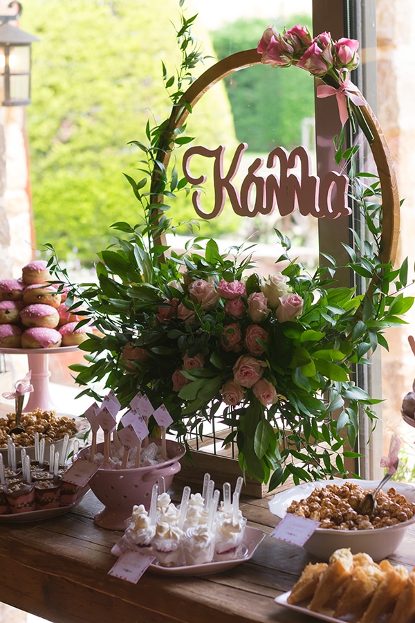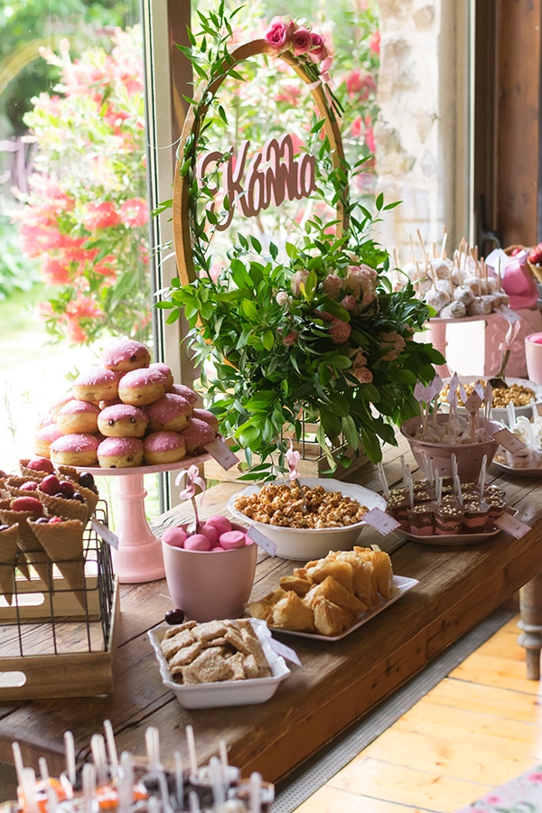 Η βάπτιση που παρουσιάζουμε σήμερα θα σας αρέσει πολύ! Οι γονείς της Κάλλιας επέλεξαν να πραγματοποιήσουν μια χαριτωμένη, γεμάτη χρώματα και λουλούδια βάπτιση για την μικρή κόρη τους. Ο χώρος στολίστηκε με χρυσά moongates στολισμένα με πρασινάδες και άνθη σε αποχρώσεις του ροζ και ροζ κορδελίτσες. Ένα πανέμορφο dessert table γεμάτο από νόστιμα γλυκά και λιχουδιές όπως καραμελωμένα ποπ κορν, παστέλια, λουκούμια, donuts και φρέσκα φρούτα, στήθηκε στο χώρο της δεξίωσης και περίμενε τους καλεσμένους. Δείτε τις παρακάτω φωτογραφίες και εμπνευστείτε!