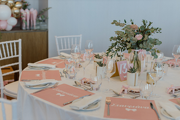 Η απόλυτα κοριτσίστική διακόσμηση της βάπτισης της μικρής Σταυριάνας από τον George Panayiotou μας κάνει να χαμογελάμε, καθώς είναι γεμάτη από πανέμορφες λεπτομέρειες! Ροζ σουπλά και χωνιά μαζί με την αρίθμηση των τραπεζιών αλλά και το seating arrangement εμπλουτίζουν με την παρουσία τους το σκηνικό, χαρίζοντας το απαραίτητο ύφος στην όλη διακόσμηση! Τα χρυσά, ροζ και λευκά μπαλόνια που τοποθετούνται δεξιά κι αριστερά του dessert table προσφέρουν μια παιχνιδιάρικη νότα στην όλη ατμόσφαιρα, ενώ αμέτρητα γλυκά και λιχουδιές σε λευκές πιατέλες υπόσχονται να γλυκάνουν μικρούς και μεγάλους. Υπέροχες συνθέσεις από ροζ τριαντάφυλλα και ευκάλυπτο στολίζουν τα τραπέζια της δεξίωσης, ενώ πρωτότυπες μπομπονιέρες από παχύφυτα δίνονται στους προσκεκλημένους! Μην χάσετε όλες τις ενδιαφέρουσες λεπτομέρειες από τον κοριτσίστικο αυτό στολισμό βάπτισης!