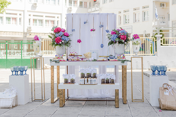 Πόσο όμορφος είναι ο στολισμός της βάπτισης της μικρής Νίκης! Η χαρά μας πλημμύρισε από το πρώτο κιόλας λεπτό όταν αντικρύσαμε όλα όσα επιμελήθηκε τόσο όμορφα το Lela Flower Shop. Το σκηνικό μεταμορφώθηκε στην κυριολεξία σε ένα παραμυθένιο setting με την επιλογή από ορτανσίες στις πιο υπέροχες αποχρώσεις του φούξια και του μωβ. H διακόσμηση της κολυμβήθρας με το εντυπωσιακό αυτό λουλουδένιο στεφανάκι που τοποθετείτε περιμετρικά αλλά και ο στολισμός λαμπάδας με το μπουκετάκι από φούξια άνθη παιώνιας και ορτανσίας σε συνδυασμό με φύλλα ευκαλύπτου προσδίδουν στη στιγμή την πιο χαρούμενη νότα σε αυτό το μυστήριο βάπτισης. Ο στολισμός απογειώνεται βέβαια στον προαύλιο χώρο της εκκλησίας με ένα dessert table πραγματικό αριστούργημα! Το backdrop από λευκές κορδέλες και κρεμαστά λουλούδια από σχοινιά ήταν μια άκρως πρωτότυπη ιδέα ενώ τα ολάνθιστα βάζα δεξιά και αριστερά ενισχύουν την ομορφιά προσκαλώντας τους καλεσμένους να απολαύσουν από κοντά αυτά τα μυρωδάτα άνθη γλυκαίνοντας παράλληλα τον ουρανίσκο τους. Από το σκηνικό δεν λείπουν δύο elegant χρυσά stands με φρέσκια λεμονάδα που πλαισιώνουν αρμονικά το τραπέζι γλυκών και από την ξεχωριστή ημέρα της βάπτισής της η μικρή Νίκη φροντίζει φίλοι και συγγενείς πάρουν μαζί τους το πιο όμορφο ενθύμιο, μικρά γυάλινα βαζάκια με παχύφυτα που θα ομορφύνουν το κάθε σπίτι!
