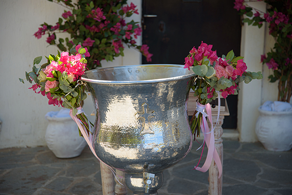 «Η βάπτιση έγινε σ’ ένα καταπράσινο αμπελώνα του απέραντου κάμπου των Μεσογείων, εντός του κτήματος Argithea Winery. Θέλαμε να συνδυάσουμε το θέμα, με τον χώρο που επιλέξαμε. Η βουκαμβίλια αποτέλεσε το κυρίαρχο λουλούδι του στολισμού μας με τις διάσπαρτες πεταλούδες να προσδίδουν ένα girly style, στη minimal διακόσμησή μας. Τελος, τα χρώματα που επιλέξαμε κινήθηκαν σε τόνους του φούξια, baby pink, λευκού με πινελιές χρυσού.» μας είπε η μαμά.