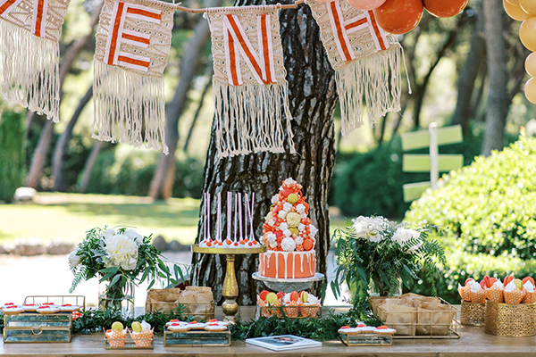 Ένα πετρόχτιστο εκκλησάκι – από τα πιο όμορφα της Αττικής, απέραντο πράσινο του υπέροχου κτήματος La Foret Country Resort που δεν χορταίνει να βλέπει το μάτι και μια απίστευτα εντυπωσιακή διακόσμηση από Melgrouplab εμπλουτισμένη με χρώματα που μας φτιάχνουν κυριολεκτικά τη διάθεση… Όλα αυτά σε μια παρουσίαση μόνο! Αρχή κάνουμε με τον στολισμό στην είσοδο της εκκλησίας και την αψίδα από pampas grass, πλούσια πρασινάδα και λευκά λουλούδια που τοποθετήθηκε στην πόρτα και συνδυάστηκε άψογα με τους φυσικούς χρωματισμούς που υπήρχαν στον περιβάλλοντα χώρο, δημιουργώντας ένα εναρμονισμένο αποτέλεσμα. Η διακόσμηση της δεξίωσης ακολούθησε ένα πιο μοντέρνο ύφος, με τα τραπέζια να στολίζονται με φρέσκα λευκά λουλούδια, pampas grass και πρασινάδες, ενώ χαρούμενοι χρωματισμοί σε κοραλλί, μουσταρδί αλλά και ροζ φώτισαν τον όλο στολισμό. Ακόμη περισσότερο, όμως, αυτό που φώτισε ιδιαίτερα τον χώρο ήταν το dessert table, που με τα φανταχτερά του χρώματα μας κέντρισε το ενδιαφέρον. Πολύχρωμα μπαλόνια, αμέτρητες λιχουδιές σε χρυσές βάσεις και μια τούρτα – υπερπαραγωγή είναι μερικά από όλα αυτά που μας τράβηξαν την προσοχή, ενώ ξεχωριστές μακραμέ δημιουργίες σχηματίζουν το όνομα της μικρής που μόλις έχει βαπτιστεί!