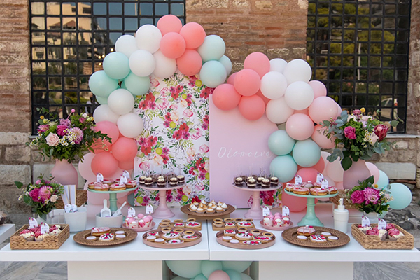 Χρώματα ανοιξιάτικα που φωτίζουν τον χώρο και γεμίζουν τις καρδιές μας χαρά και αισιοδοξία, επέλεξε η Natali Markou Event Planning για την διακόσμηση της βάπτισης της μικρής Δέσποινας στη Θεσσαλονίκη, εντυπωσιάζοντας μικρούς και μεγάλους από το πρώτο λεπτό! Πιατέλες σε αποχρώσεις του ροζ και της μέντας γέμισαν με λαχταριστά γλυκά και νόστιμα ζαχαρωτά από Peace n Cake κι έδωσαν την δικιά τους παρουσία στο candy table, το οποίο εμπλουτίστηκε με μπουκετάκια από εντυπωσιακά άνθη σε έντονα girly χρώματα, ενώ μπαλόνια στις ίδιες αποχρώσεις και μοναδικά backdrops σε floral μοτίβα από Infinity Creative Designs by Ioanna Papapetrou ολοκλήρωσαν με τον καλύτερο τρόπο το όλο θέαμα. Από το σκηνικό δεν λείπουν και οι αλμυρές λιχουδιές, ενώ παραδίπλα στήνονται επιπλέον stands με μπομπονιέρες – παχύφυτα να προσφέρονται ειδικά για τους καλεσμένους της μικρής Δέσποινας. Ένα είναι το σίγουρο πως η Natali Markou Event Planning έδωσε για ακόμα μια φορά τον καλύτερο της εαυτό με το αποτέλεσμα να ξεπερνάει κάθε προσδοκία!