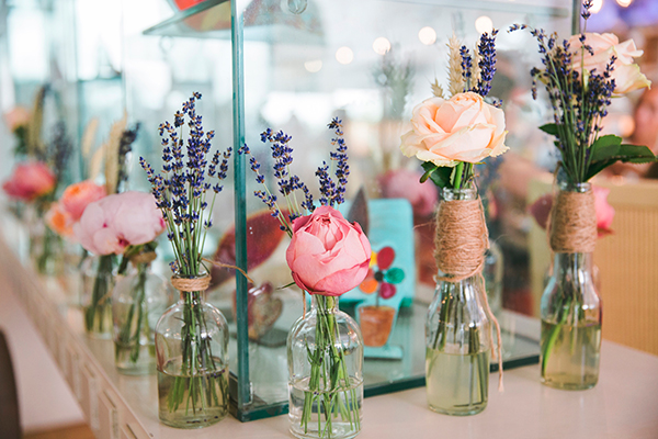 “Τη βάπτιση αυτη τη στήσαμε εξ’ολοκλήρου με επικοινωνία με την αγαπημένη θεία της μπέμπας Αριάννας, καθώς όλη η οικογένεια ζει στο εξωτερικό. Δημιουργήσαμε ένα custom made προσκλητήριο σε δυο γλώσσες με τα λουλούδια του θέματος μας, τη λεβάντα και τα garden roses, και το βάλαμε σε τούλινο φάκελο με φυσικά άνθη λεβάντας. Ο στολισμός έξω από την εκκλησία δημιούργησε ένα υπέροχο νεραιδένιο σκηνικό, με δέντρα και άπειρα κρεμασμένα μπουκαλάκια με λουλούδια…”
