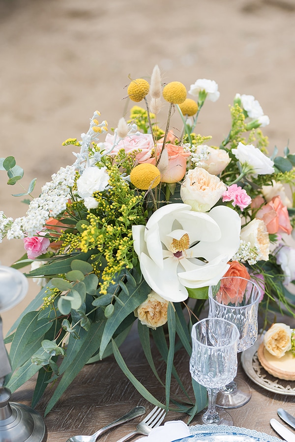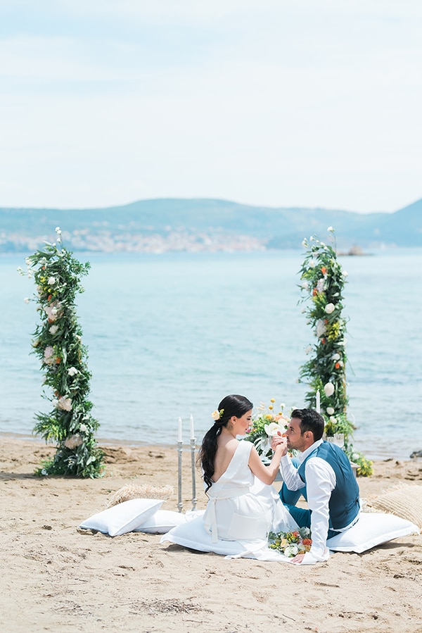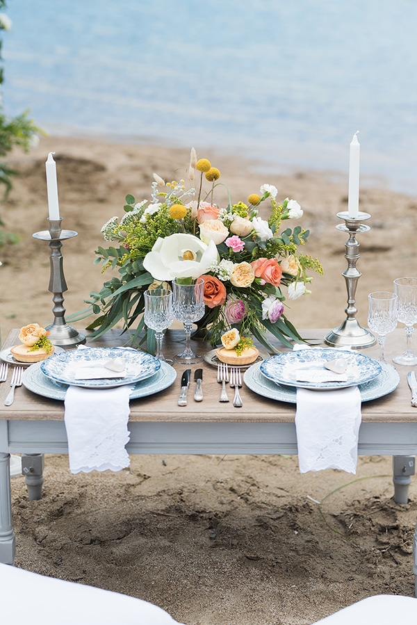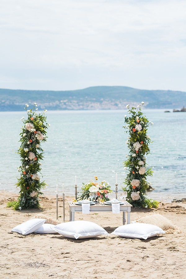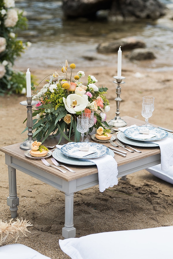 «Τα προσκλητήρια και τα βιβλιάρια με τους όρκους ήταν ζωγραφισμένα στο χέρι με λουλούδια από νερομπογιές! Αυτό που μας άρεσε περισσότερο ήταν οι κάρτες με τα ονόματα του ζευγαριού με απαλές χρωματιστές πινελιές! Στήσαμε ένα τραπέζι για δύο, με μαξιλάρια, πιάτα με ιδιαίτερα μοτίβα, ασημί αποχρώσεις και πετσέτες με κεντήματα. Ήταν ένα εντυπωσιακό picnic με μαξιλάρια στην παραλία όπως αρμόζει σε έναν καλοκαιρινό γάμο!»