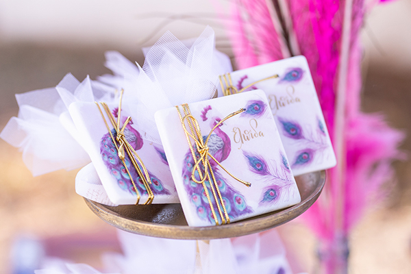 Η μοναδική ομορφιά του παγωνιού κυριαρχεί στη σημερινή βάπτιση και το σκηνικό που συνθέτει το Stamataki Showroom & Events μοιάζει βγαλμένο από παραμύθι! Η μικρή Ελπίδα με το γεμάτο αισιοδοξία όνομά της σκορπίζει τη χαρά στους γύρω τους με την υπέροχη βάπτισή της που έχει τα πιο χαρούμενα χρώματα. Μωβ – ροζ αποχρώσεις και φτερά παγωνιού συνδυάζονται με ορτανσίες και τριαντάφυλλα στα ίδια χρώματα για τον στολισμό τόσο της κολυμβήθρας όσο και του candy table που προσφέρει κάθε λογής γλυκά για μικρούς και μεγάλους! Η φιγούρα του παγωνιού αποτελεί ένα ξεχωριστό και πρωτότυπο backdrop ενώ η ομορφιά του αναπαρίσταται στην κάθε γωνιά, από το βιβλίο ευχών, τις μπομπονιέρες – καδράκια μέχρι και τα lollipops και μπισκοτάκια που πέρα από όμορφα φαίνονται άκρως λαχταριστά! H διακόσμηση κλέβει κυριολεκτικά την παράσταση και σας δείχνει το δρόμο για ένα πρωτότυπο θέμα κοριτσίστικης βάπτισης με τις πιο inspiring details!
