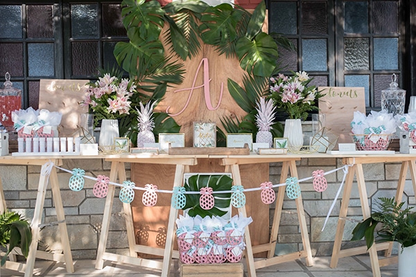 Σήμερα μοιραζόμαστε μαζί σας υπέροχες ιδέες διακόσμησης για μια tropical theme καλοκαιρινή βάπτιση που θα λατρέψετε! Η Feather Events επέλεξαν να ντύσουν αυτό το υπέροχο dessert table με τον αξιολάτρευτο συνδυασμό του ροζ και του mint δημιουργώντας ένα ονειρεμένο σκηνικό που σε συνεπαίρνει. Ένα rustic τραπέζι με ξύλινο backdrop διακοσμείτε με τροπικά φυλλώματα, χρυσά διακοσμητικά frames και διακοσμητικά τροπικών φρούτων προσκαλώντας μικρούς και μεγάλους να απολαύσουν κάθε λογής γλυκές λιχουδιές και δροσιστικά ροφήματα. Ξεχωρίσαμε αυτή την πρωτότυπη ιδέα παρουσίασης λαχταριστών donuts πάνω σε ένα εντυπωσιακό ξύλινο stand… ήταν τόσο δελεαστική και μοναδική ταυτόχρονα! Απολαύστε αυτές τις υπέροχες ιδέες διακόσμησής μέσα από τις παρακάτω φωτογραφίες και εμπνευστείτε και εσείς για μια tropical theme βάπτιση!