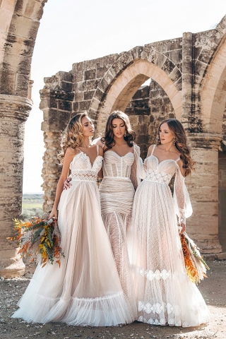 Μια πανδαισία από δαντέλα, τούλι και μετάξι έρχονται να συνοδεύσουν την γυναίκα στην σημαντικότερη στιγμή της ζωής της. Δημιουργίες που αγκαλιάζουν το σώμα, αναδεικνύουν την προσωπικότητα της και την μετατρέπουν σε μια αιθέρια ύπαρξη.