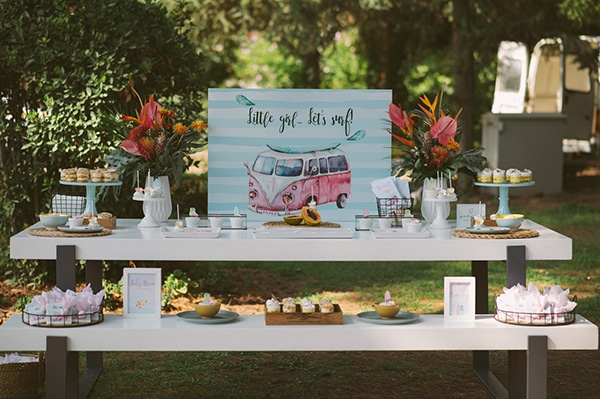 Καλοκαιρινή βάπτιση κοριτσιού στη Θεσσαλονίκη με κόκκινες κάλλες και θέμα το surf