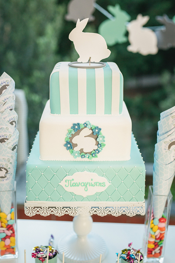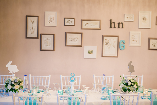 “Η όλη ιδέα για το θέμα “Vintage Rabbit” που επιλέξαμε, ξεκίνησε από ένα παιδικό κουβερτάκι της προίκας του μωρού, που είχε κεντημένο ένα λευκό κουνελάκι. Το μωράκι μας δεν το αποχωριζόταν ποτέ από τη γέννηση του και έτσι αποφασίσαμε να το κάνουμε πρωταγωνιστή της βάπτισης!”