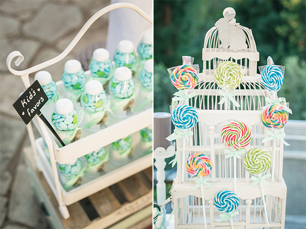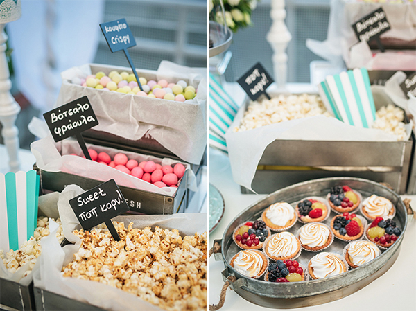 “Για το χώρο αυτό, δημιουργήσαμε ένα Candy Buffet με στοιχεία διακόσμησης vintage open market: πολύχρωμα τρουφάκια, pop cakes, macarons, ταρτάκια φρούτων και φρέσκα donuts ήταν μερικά από τα γλυκίσματα για τους καλεσμένους μας, καθώς και marshmallows και γλειφιτζούρια για τα παιδιά! Φυσικά δε θα μπορούσανε να λείπουν και τα ποτά, γι’ αυτό με την βοήθεια των συνεργατών μας της Little Drinks, σχεδιάσαμε και ένα Drink Buffet σε παραδοσιακό λευκό καροτσάκι, όπου σερβίρονταν mint λεμονάδα, peach ice tea και νερό.”
