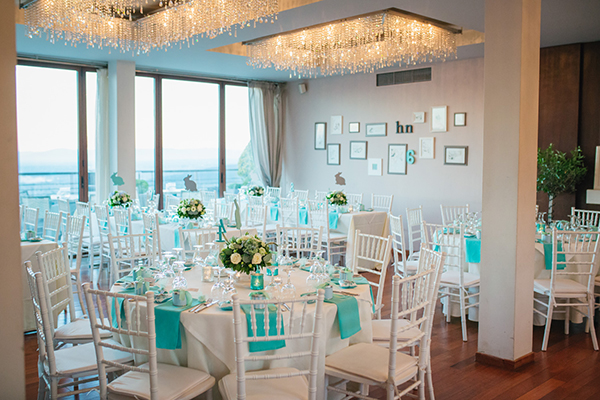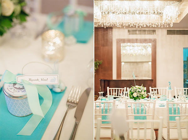 “Ως σχεδιαστές εκδηλώσεων της Mya Wedding, το πλαισιώσαμε γραφιστικά με ένα στεφάνι από ορτανσίες και ο συνδυασμός χρωμάτων που επιλέξαμε ήταν tiffany blue, fresh mint και dusty grey. Ο χώρος που επιλέξαμε για την τέλεση του μυστηρίου ήτανε το παρεκκλήσι των Τριών Ιεραρχών του Κολεγίου Ανατόλια, αγαπημένη τοποθεσία αφού βρίσκεται ψηλά στον λόφο σε ένα κήπο γεμάτο έλατα και πεύκα.”
